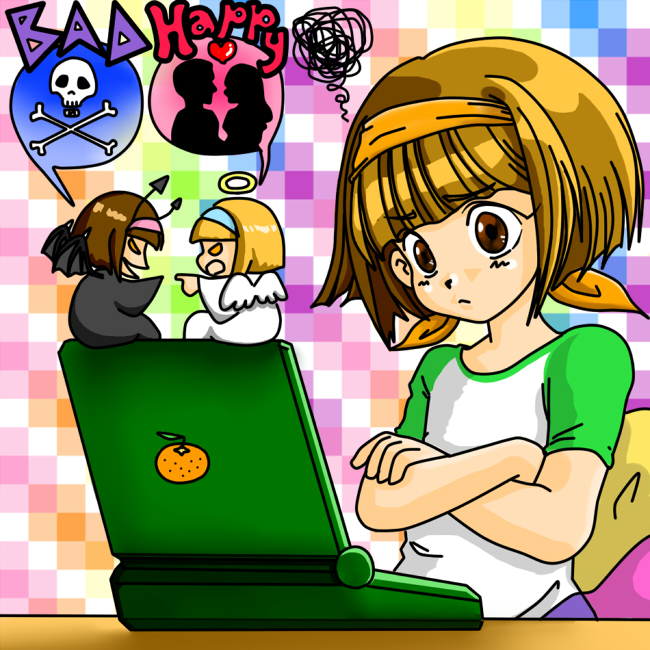 いつもお世話になってます。こちらにはクールミカンというPNで時々お邪魔しています。縮小するとわかりづらくなってしまったのですが、オチを巡って脳内会議中……というシチュエーションです。